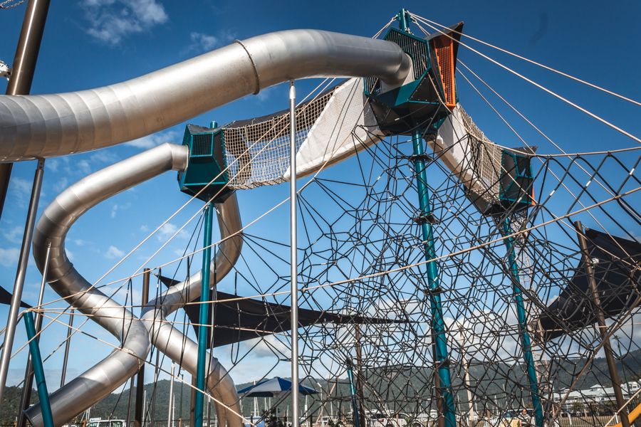 The large outdoor playground is the first thing you will see from a distance, as the 10m high design beckons the young and young at heart alike. Situated high in the sky, the structure is almost an abstract work of art, with silver slides slithering throughout, and geometrical spider webs creating an optical illusion for the senses, and a challenging obstacle course for the body. While netted bridges swing high mimicking a pirate ship for the older kids, there is also a smaller pirate ship themed structure lower to the ground for the little ones. Council assures us the silver slides are heat protected, so you can even slide in the summer heat without worry.