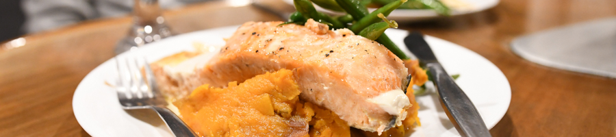 Dinner: Honey Lime Baked Tasmanian Salmon served with Marbled Rustic Mashed Sweet Potatoes, Seasonal Green Vegetables and Peri Peri Aioli.
