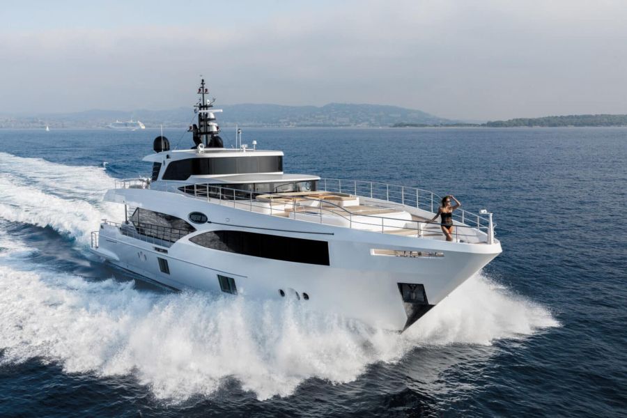 - A refined, 100-ft superyacht with luxe sunbeds, bathing platform, and pool