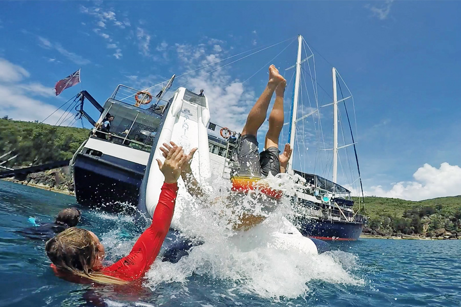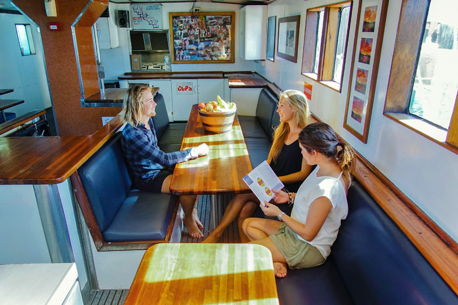 Choose from double, triple and quad share cabins all with the comfort of air-conditioning throughout. The spectacular air-conditioned saloon complete with TV and DVD a large dining area, lounge and cocktail bar offers a gigantic area to socialise and meet new friends. With plenty of room above decks to sunbathe, relax in the shade, have fun on the water slide, or take a splash in the 12 person spa, you will have the time of your life!