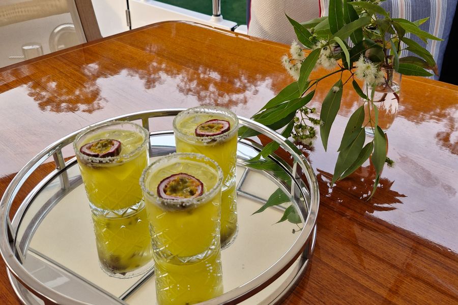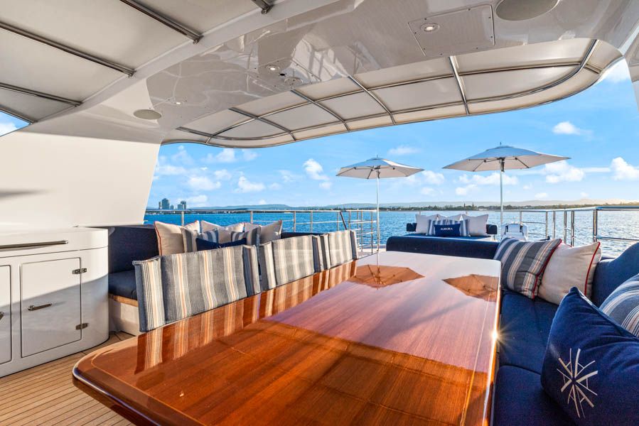 Aurora is an 84 foot luxurious superyacht, perfect for intimate gatherings of up to 33 guests. Spend a day exploring the Whitsunday Islands visiting iconic locations, secluded bays and fringing coral reefs aboard the newly refit, Aurora. The spacious exterior includes three deck areas, upholstered seating, a bar, a gourmet BBQ, an eight-seater dining area and an outdoor cinema! In the stylish interior you will find a comfortable saloon with a bar, another dining area, a 44 inch smart TV and a small library. Aurora also has a fully-equipped galley with a wine fridge and the finest cooking appliances.