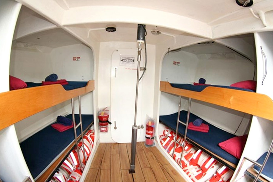 Similar to famous racing ships, Boomerang offers bunk-style accommodation. Comfortable single and double bunks line the inside of the hulls, leaving lots of room for social space.