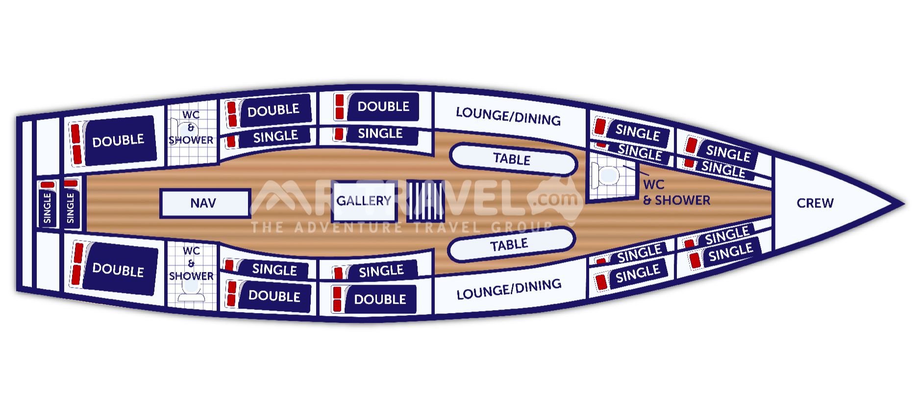 The saloon features 2 dining tables so that everyone can dine together in comfort, unlike other vessels where lap dining is the norm. British Defender has 3 bathrooms with hot showers and toilets. On deck, the boat is wide, so there's plenty of deck space to chill out, plus there is a shade awning built into the boom which extends over the whole centre deck space. Defender carries a maximum of 26 guests plus the 4 crew. Onboard are 6 double bunks, 14 single bunks.