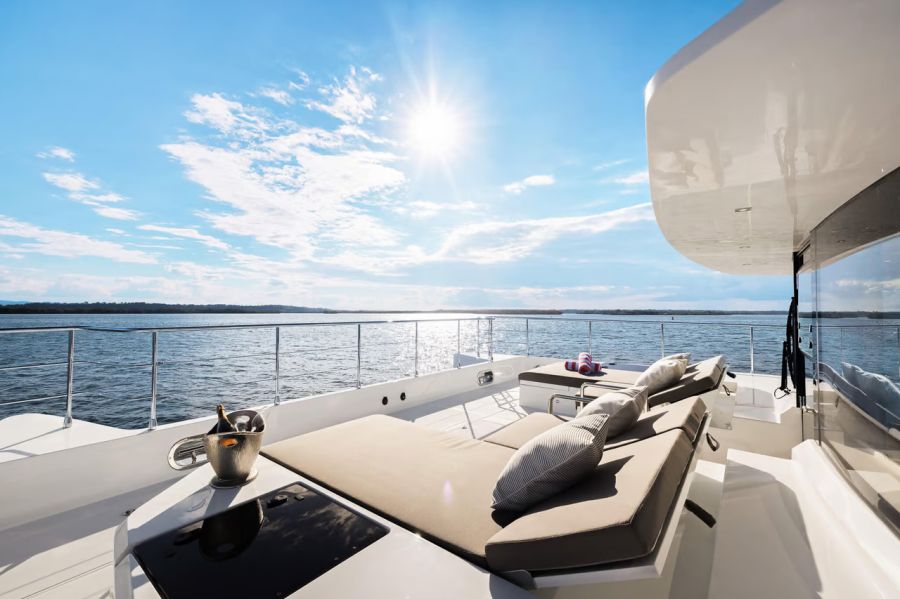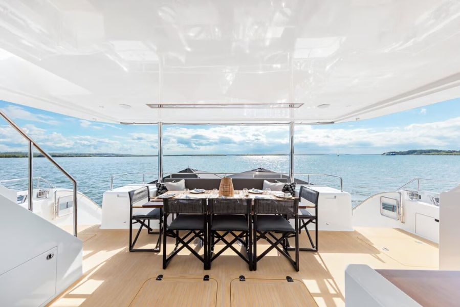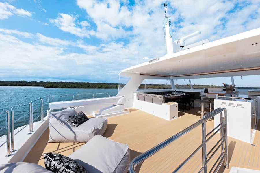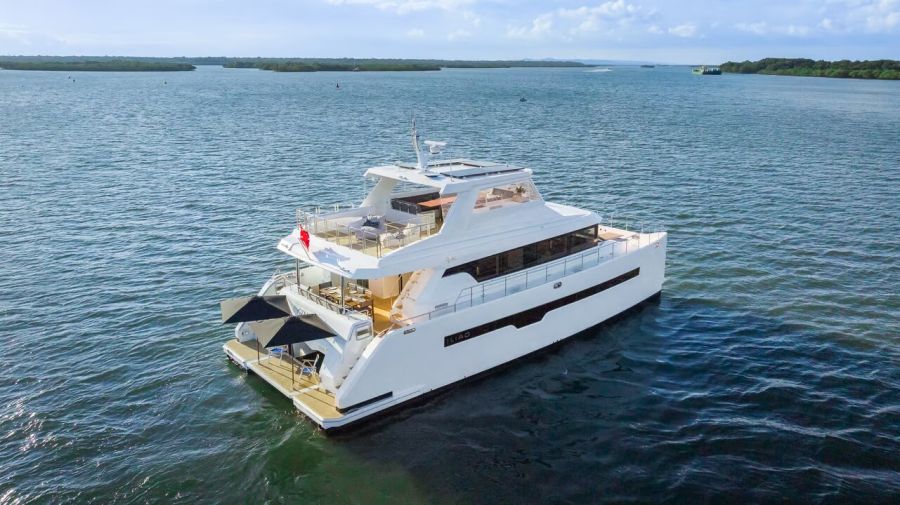 - 62-foot Iliad luxury catamaran with modern styling and premium amenities