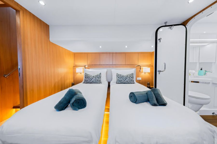 - Cabin configurations: 1 x Master Cabin, 1 x Queen Cabin (convertible to a twin), 1 x Twin Cabin (convertible to a queen)