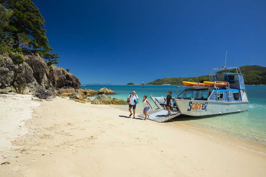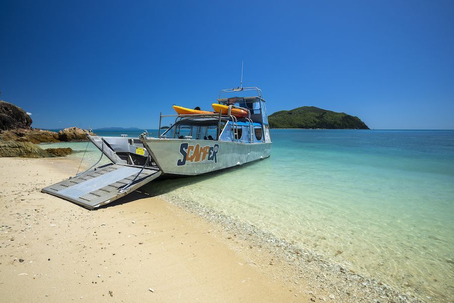 Enjoy a smooth and stable one-hour boat ride from Shute Harbour to Hook Island in the versatile and sturdy Scamper Vessel. The boat is designed to transport adventure gear such as kayaks and bikes, with plenty of storage space onboard and on the roof.