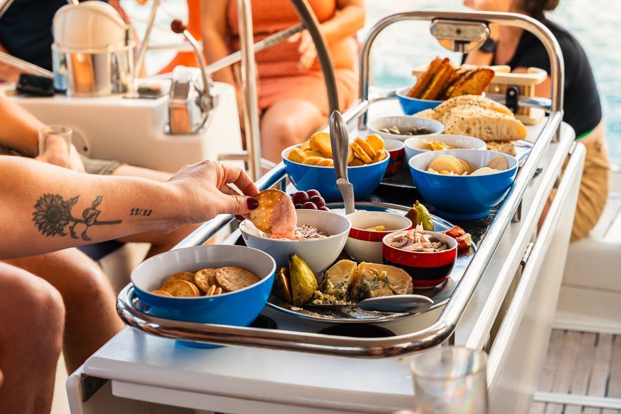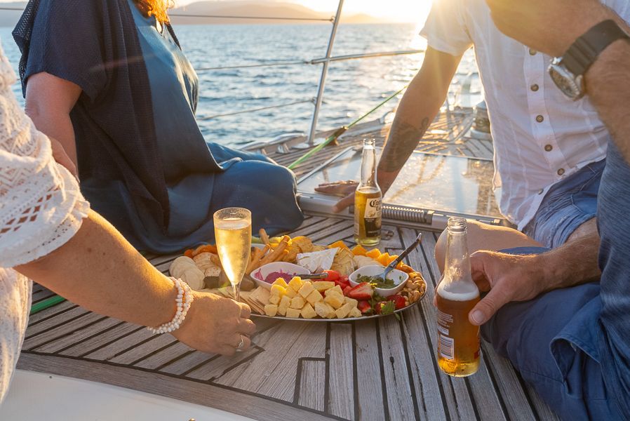 The Bespoke Sunset charter on MiLady includes a glass of bubbles for each guest and an additional glass of bubbles. You will also get a charcuterie board with fresh prawns.