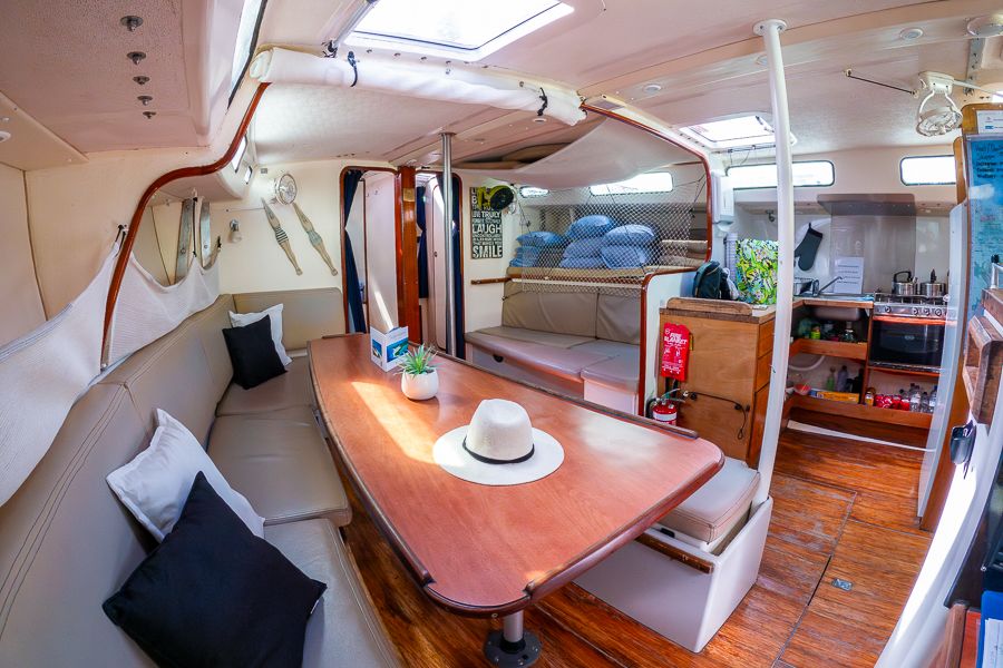 Shared saloon accommodation - There are 2 single bunks and a double bed in the main saloon, and a shared bathroom with other guests