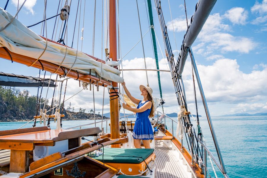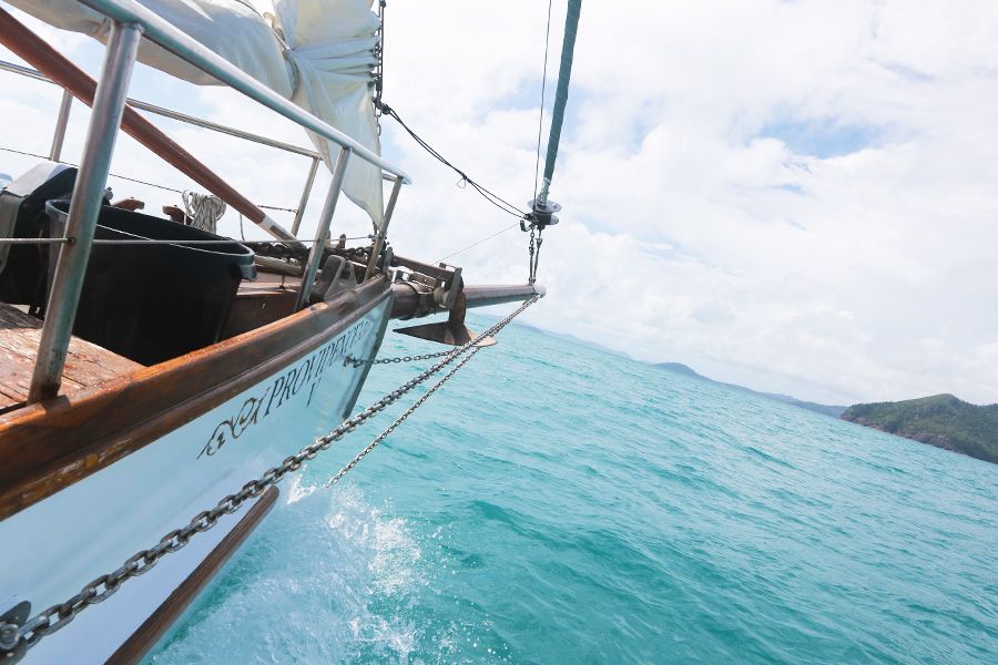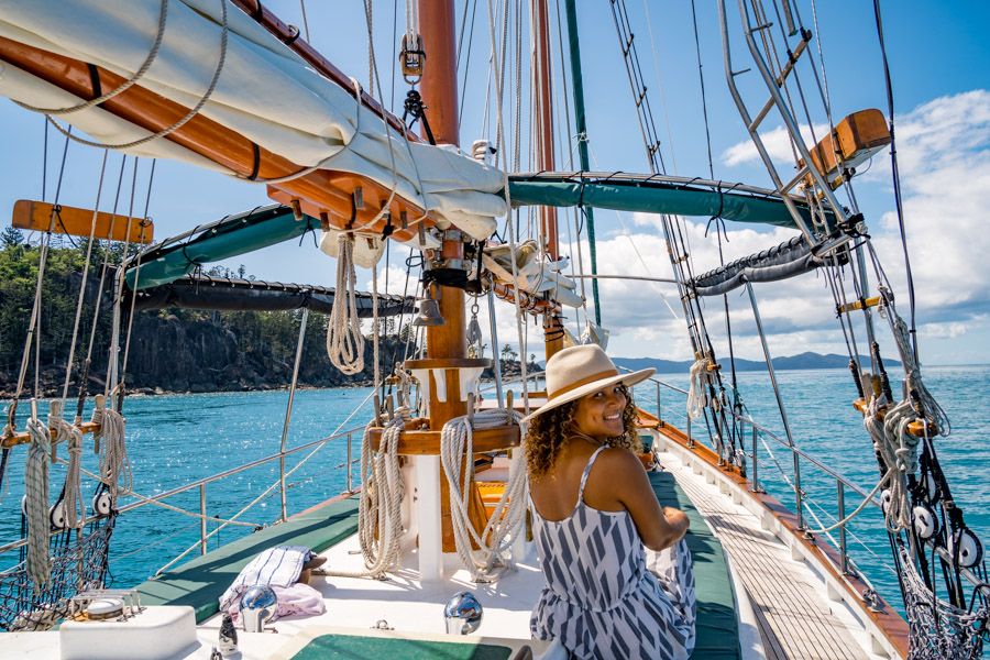 A private sunset charter on Providence V offers guests the chance to see the stunning Whitsundays in a new light. Enjoy golden hour out on the water as you sail around the Coral Sea in an impressive schooner tallship. Sip champagne, taste a few snacks, get some excellent photos, and feel the tropical breeze as you sail around Airlie Beach at sunset.