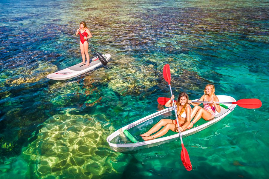 - Snorkel equipment, clear, glass bottom canoe, sea scooter, and stand-up paddleboards included
