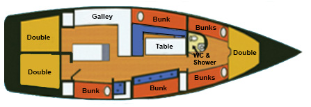 - Shared Double: Double bed (sleeps two persons), usually with a single bunk on top.